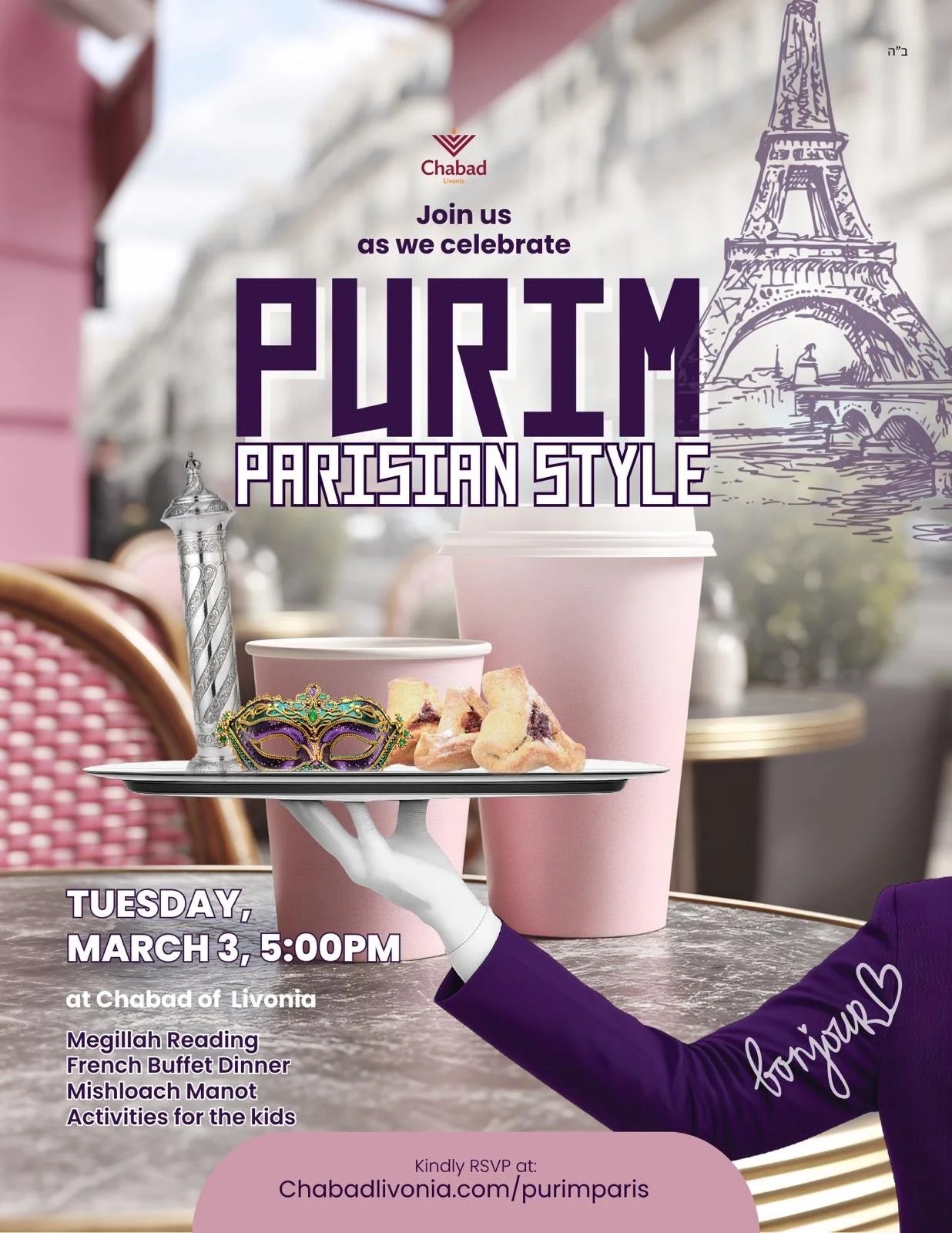You are warmly invited to celebrate Purim with a Parisian twist at the new home of Chabad of Livonia.